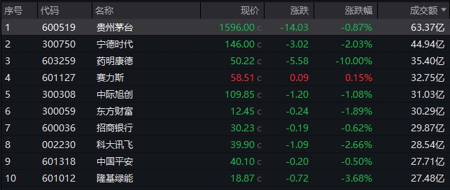 沪深两市今日成交额8057亿,较上个交易日放量1027亿。个股方面,贵州茅台今日成交额63.37亿元居首,宁德时代成交额44.94亿元位居第二位,药明康德、赛力斯、中际旭创、东方财富成交额均超30亿元。